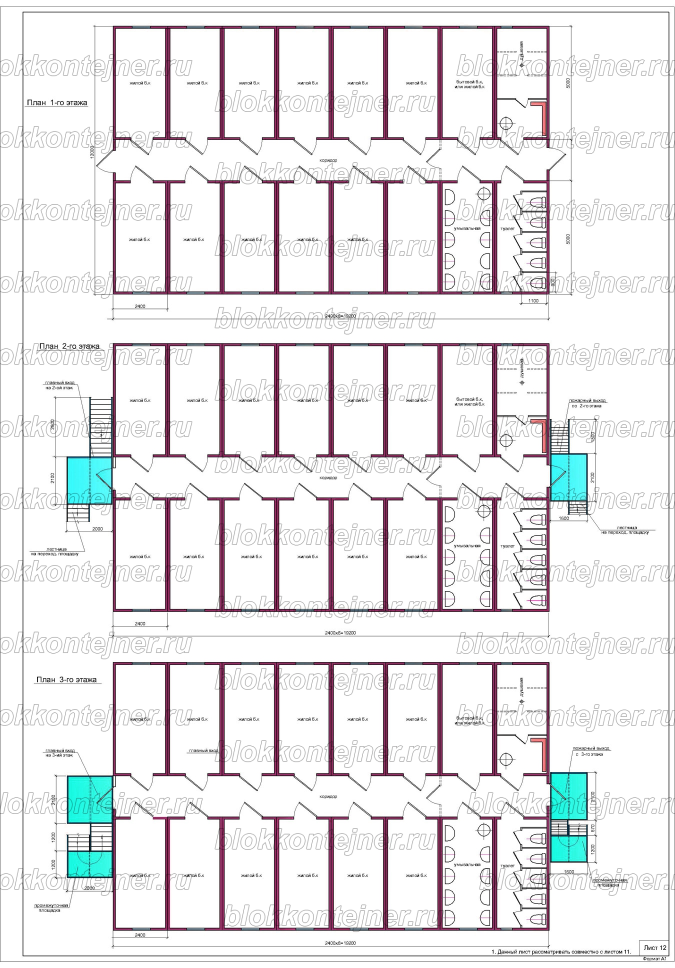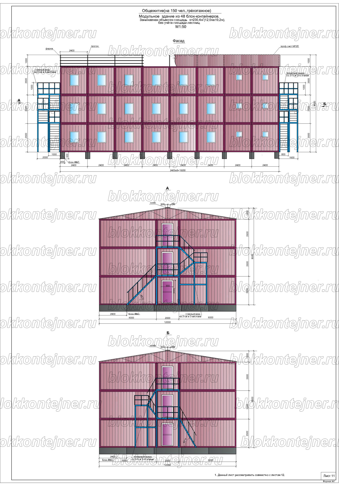 Общежитие на 150 человек, трехэтажное из 36 БК